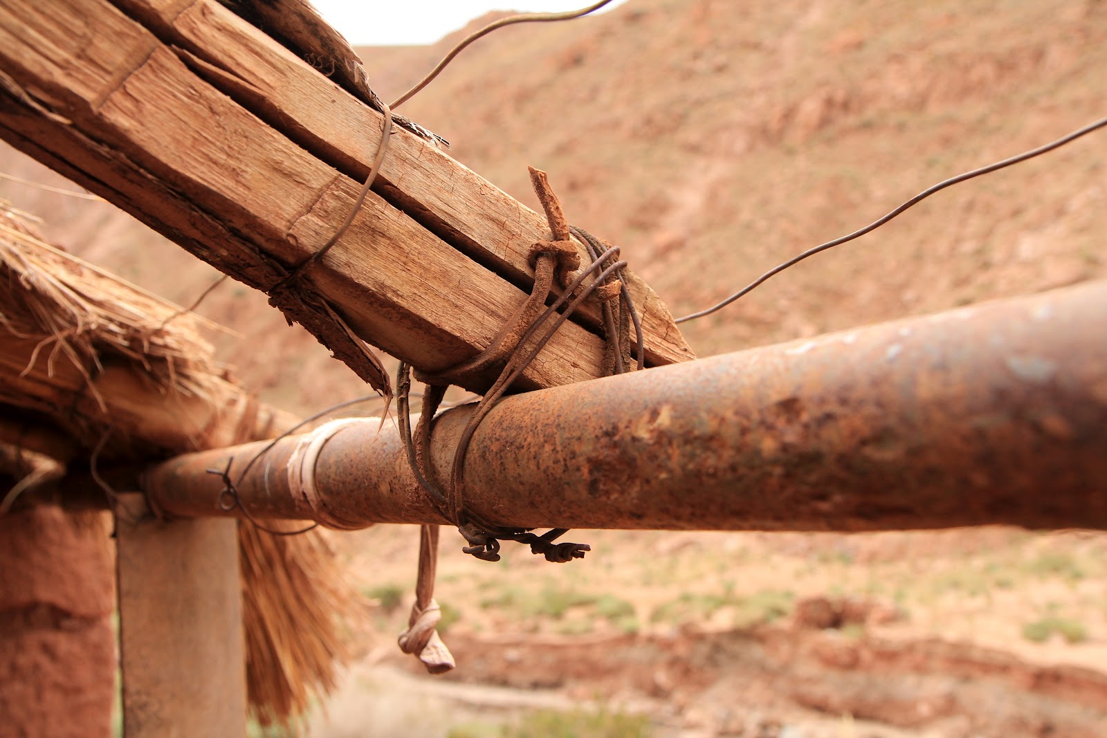 This is a corral they use to shear the llama and Alpaca in the region. Right next to it there happens to be a crop of vegetables being grown. To keep the animals from wandering in to the crops and eating to their hearts content (and to keep them from getting tangled in the barbed wire surrounding the crops) they hang rags on the fence so that it is more visible. They also put hard hats on sticks as a makeshift scarecrow and this keeps the little ones at bay. |